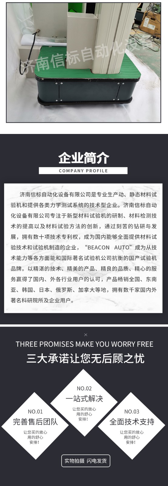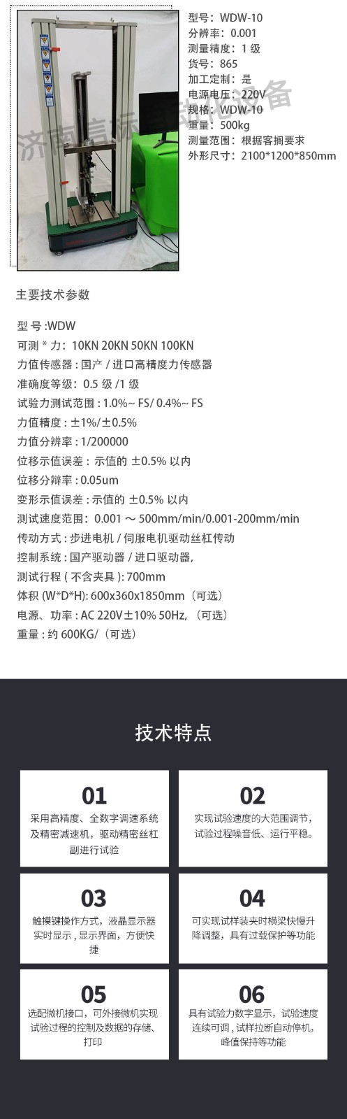 基本信息 型號:WDW-10 分辨率:0.001 測量精度:1級 貨號:865 加工定制:是 電源電壓:220V 重量:500kg 測量范圍:根據(jù)客戶要求 外形尺寸:2100*1200*850mm 可測試驗力: 10KN 20KN 50KN 100KN 力值傳感器: 國產(chǎn)/進口高精度力傳感器 準確度等級: 0.5級/1級 試驗力測試范圍: 1.0%~ FS/ 0.4%~ FS 力值精度: ±1%/±0.5% 力值分辨率: 1/200000 位移示值誤差: 示值的±0.5%以內(nèi) 位移分辯率: 0.05um 變形示值誤差: 示值的±0.5%以內(nèi) 測試速度范圍: 0.001~500mm/min/0.001-200mm/min 傳動方式: 步進電機/伺服電機驅(qū)動絲杠傳動 控制系統(tǒng): 國產(chǎn)驅(qū)動器/進口驅(qū)動器, 測試行程(不含夾具): 700mm 體積(W*D*H): 600x360x1850mm(可選) 電源、功率: AC 220V±10% 50Hz,(可選) 重量: 約600KG/(可選) 自動停機裝置 機械、程控